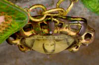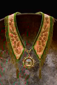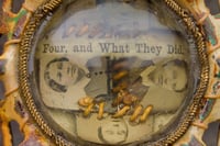 Spigot handle, tintypes, waxed linen thread, resin, beachworn soda can bottom, opals, 16th-century Ukrainian illuminated manuscript, 19th-century engraving and Asian text, brass wire, 19th-century Masonic embroidered ceremonial sash, paper, text, paint, soil.